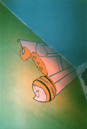 The beginning of the mural on the north wall of the studio. It's almost like he's about to fly out of your computer!